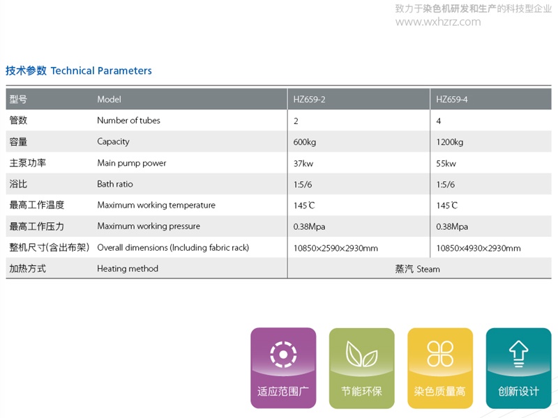HZ659系列低张力无轮驱动染色机采用无导布轮设计,合理利用三喷嘴系统,依靠液流带动布匹极低张力情况下运行。使布匹在整个生产染色过程中,无机械张力牵制,自然的随液流推力进行运转。对目前印染行业高密度超薄敏感类织物有着非常优质的染色效果。
